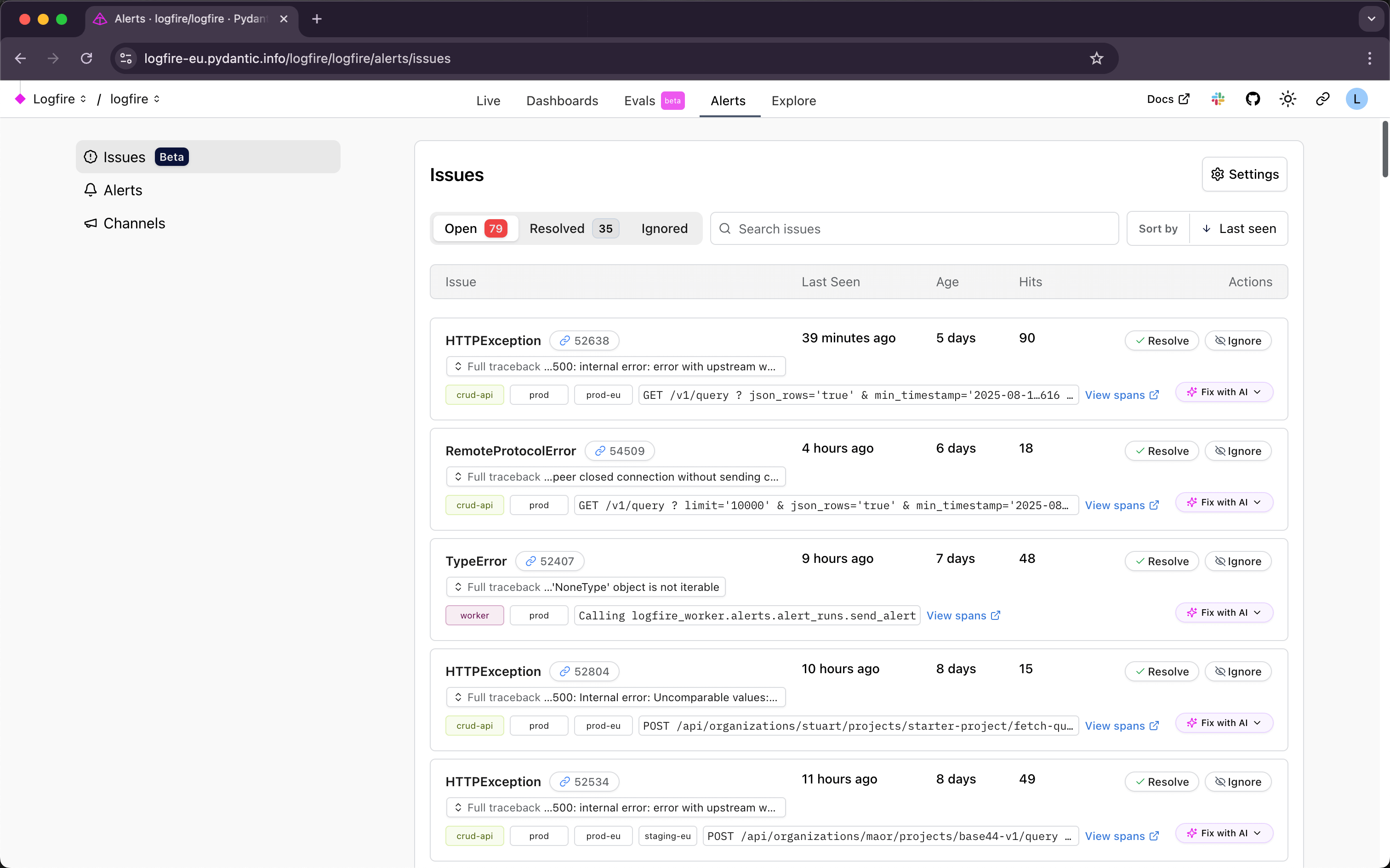 Issues are automatically created when Logfire detects exceptions in your application. Instead of manually searching through individual exception logs, Logfire groups similar exceptions together based on their fingerprint, giving you a clear overview of problems affecting your application.